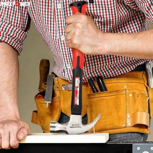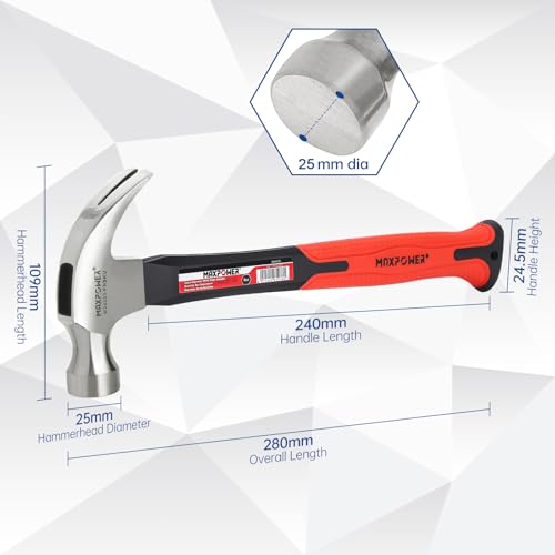 MAXPOWER Claw Hammer 8Oz, Curved Rip Framing with Polished Carbon Steel Head & Fiberglass Handle with Rubber Grip