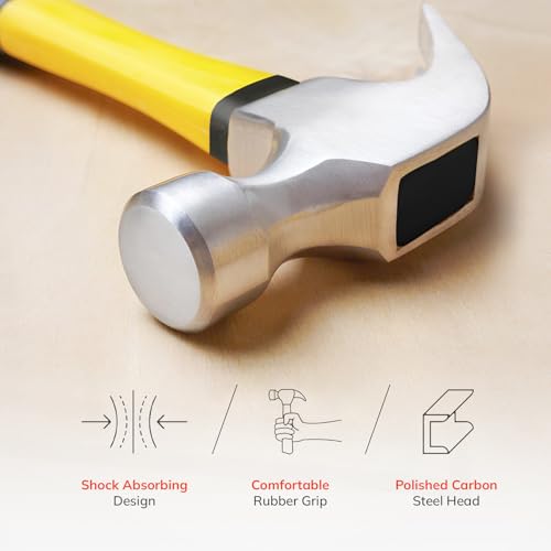 ZAVIA Claw Hammer 16oz Carbon Steel Nail Remover and Nail Puller | 450g Curved Claw Hammers for Carpenters & Electricians Framing Hammer with Non-Slip Rubber Grip | Solid Fiberglass Shaft