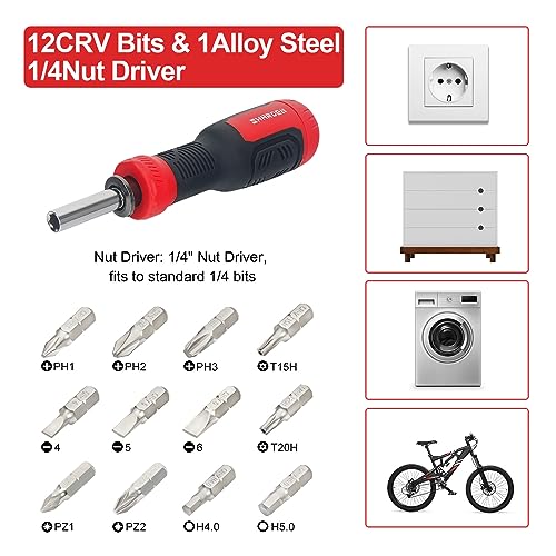 Tool Saver: SHARDEN versatile 13-in-1 screwdriver includes a 1/4 inch nut driver and 12 common used screwdriver bits: T15/T20 Security Torx, 4mm/5mm/6mm Flathead, PH1/PH2/PH3 Philips, H4/H5 Hex, and PZ1/PZ2 Pozidriv. All the bits needed in one screw driver, reduce the number of tools you must carry