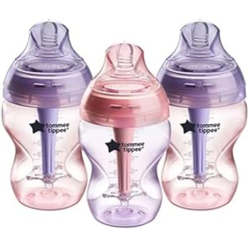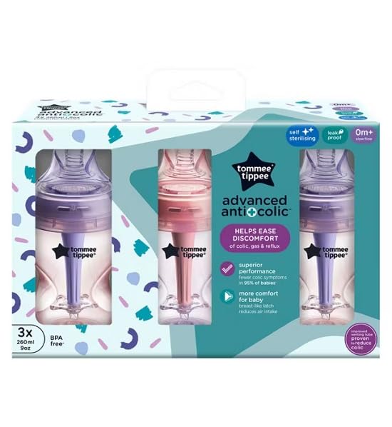 Specification: Tommee Tippee Advanced Anti-Colic Baby Bottle, 260ml, Slow-Flow Breast-Like Teat for a Natural Latch, Triple-Vented Anti-Colic Wand, Pack of 3, Purple/Pink