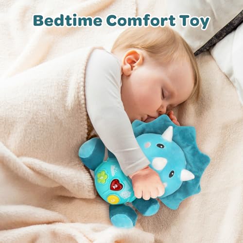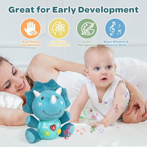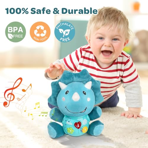 MOONTOY Musical Toys for Babies 6 9 12 Months, Luminous Plush Dinosaur Music Toy with 12 Songs, Interactive Early Learning Infant Light Up Baby Toys for 1 Year Old Girls Boys Christmas Birthday Gifts