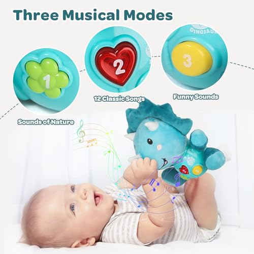 Interactive Music Toy: The dinosaur music toys for 1 year olds is a light-up musical baby toys with 3 buttons that can play 12 classic songs, natural sounds, and fun sounds. Gently shake the dinosaur baby musical toys 6 12 months and the it will make crisp baby laughter. This baby girl toys 6 12 months offers a variety of music options to meet the needs of different occasions.