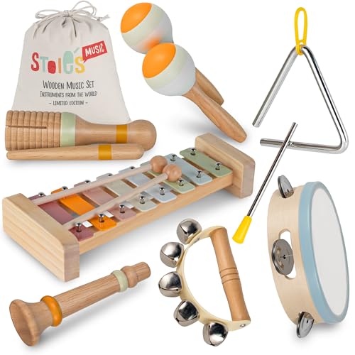 All-in-One Music Set: Fill your child with the joy of music with stoies wooden toddler musical instruments for kids. Each set includes an 8-tone Xylophone with matching mallets, a Tambourine, two Maracas, a Hand bell, a Clarinet, a Triangle with Striker, Wood sounder and handy cotton storage bag.