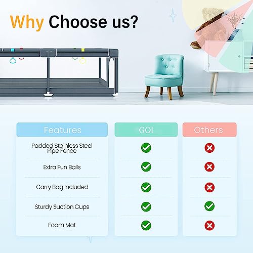 COZY FOAM MAT – Experience the comfort of our unique GOI foam play mat, creating a soft surface that is easy to clean. It can also be easily removed from the baby playpen for use as an additional baby mat indoors or in your yard.