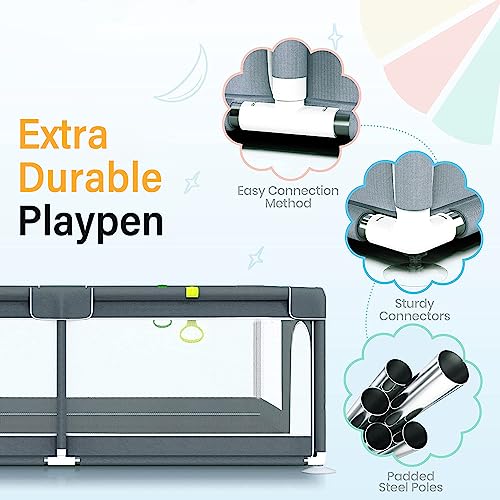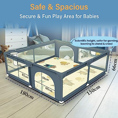 ROBUST, SAFE & DURABLE – Ensure the safety of your infant, child, or toddler in this spacious 70.8 x 59inch (180cm x 150cm) playpen for baby and toddlers.Our playpen is crafted with stainless steel poles, plastic connectors, heavy-duty tear-resistant fabric, and anti-slip base pads.