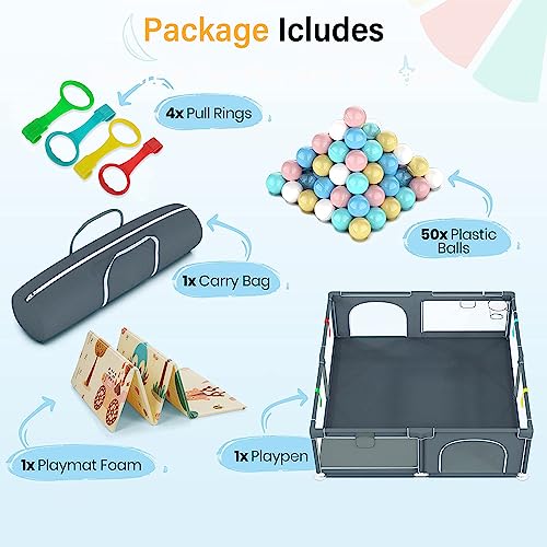Specification: GOI Baby Playpen with Mat 180 x 150 cm, Play Pen Babies and Toddlers with 50 Ball Pit, 4X Handles, Zippered Door, Basket Net, and Breathable Mesh – Extra Large Baby Playpen with Storage Bag