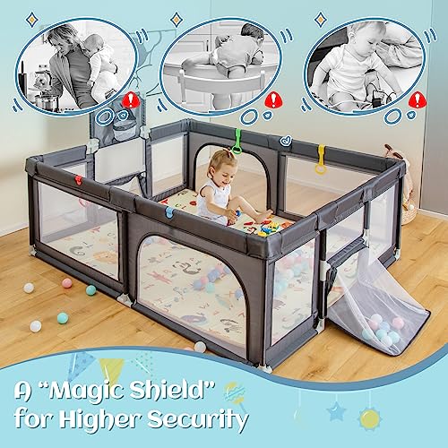 GYMAX Baby Playpen, Large Toddler Fence Play Yard with 50 Ocean Balls, Soft Mat, Basketball Hoop and Soccer Nets, Indoor Outdoor Infant Activity Center (Dark Gray, 187 x 157 x 68cm)