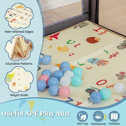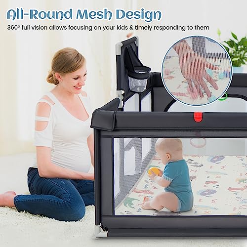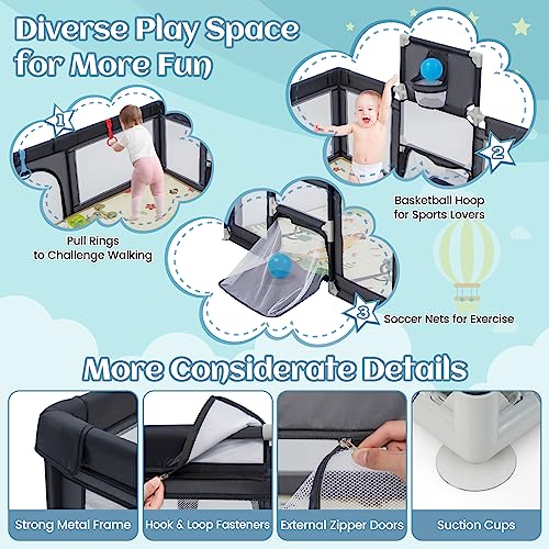 Specification: GYMAX Baby Playpen, Large Toddler Fence Play Yard with 50 Ocean Balls, Soft Mat, Basketball Hoop and Soccer Nets, Indoor Outdoor Infant Activity Center (Dark Gray, 187 x 157 x 68cm)