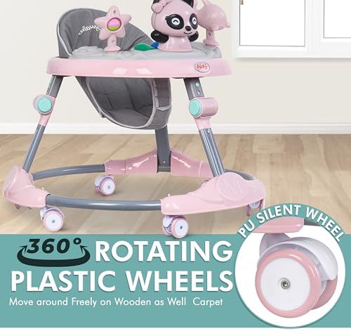 Multifunctional Foldable Baby Walker with 6 Adjustable Heights, Activity Center, Portable Music, Toys, Food Tray & Silent Wheels – Baby Walker for Boys & Girls 6 Months + – Easy Fold (Pink)