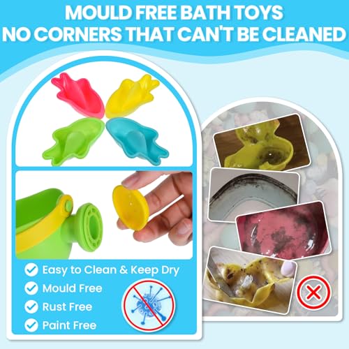 【Safe anti mould bath toys】 Made from high quality Bisphenol A free materials, this set of bathtime toys is safe and non-toxic, comes in a variety of styles, bright colours and is well made, easy to clean and keep dry with no hygiene risk of mould and mildew, as there are no crevices or corners for water to stay in, it is recommended that the toys are dried and stored out of the bathroom after bathing.