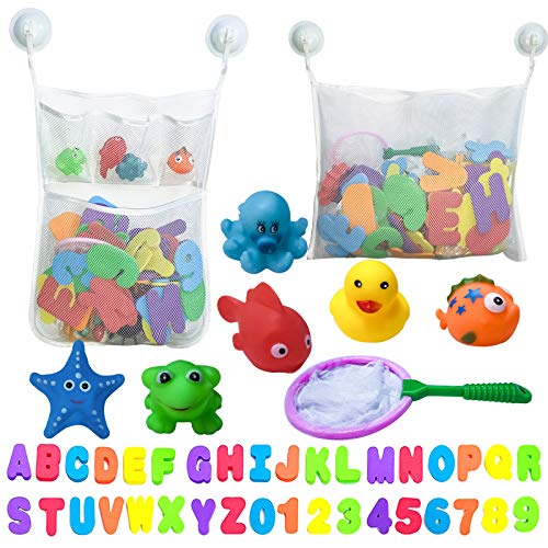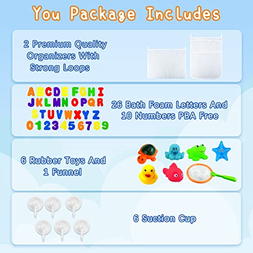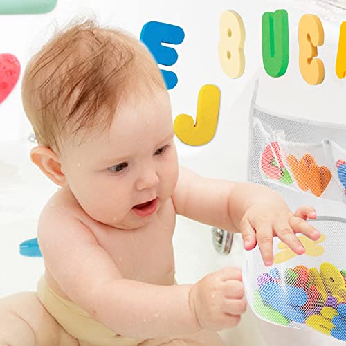 Bath Toy Holder Organizer Set – 2 Quick Dry Storage Net with Soft Foam Bathtub Letters & Number and Fish Net & Additional Suction Cups for Toddlers Kids Games Learning