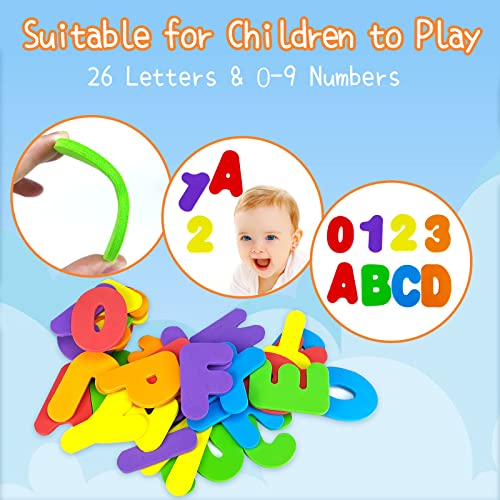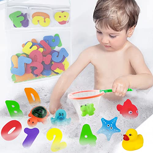 🎁【 Game and Learning by Bath Toys 】: Children can learn fishing with fish net and foam letters and soft ducks. Every number or letter is picked up by fish net and the child must be very happy! We teach to know them. Also Floating bath toy, Soft rubber letters and numbers float in the water, kids can grab it and squeeze it , Helps baby develop fine motor skills.