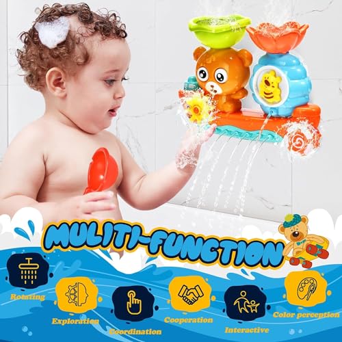 【FUN IN BATH TIME】Bear bath toys for toddlers is waterfall station toy with rotating eyes and bees, pipe outlet with boat shape, spinning rudder and propeller functions. Fill, flow and spin. Toddlers can play game by themselves when taking a bath.
