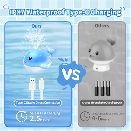 Rechargeable and Easy Charging: Different from many bath toys that need placing batteries in, this whale bath toy is equipped with rechargeable batteries, saving time to replace batteries. It includes a USB C charging cable and the charging port is protected with a waterproof cover, so it is easy and safe to charge
