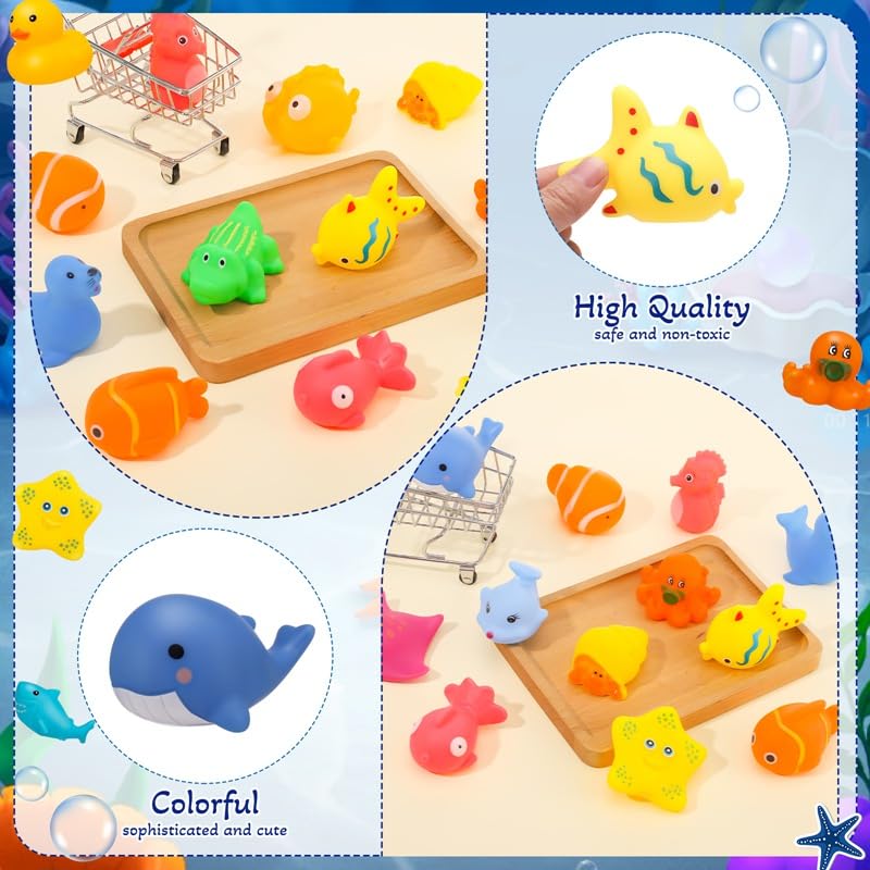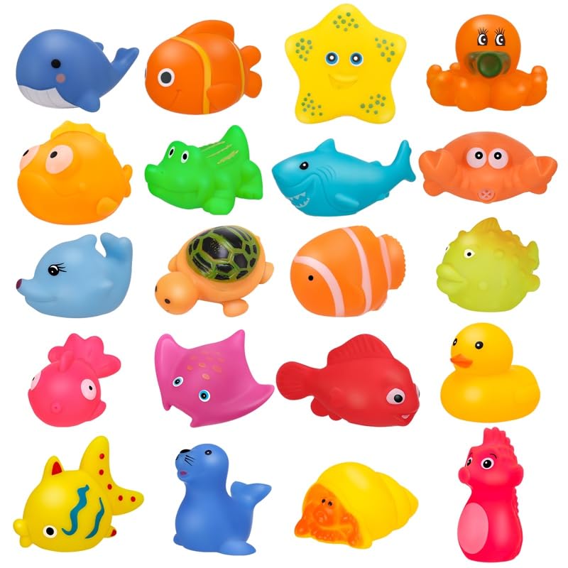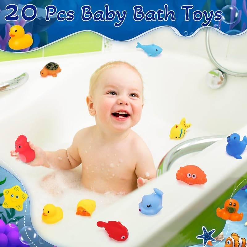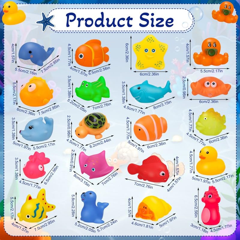 Baby Bath Toys: You will receive 20 pcs baby bath toys in sea animal shapes, includingDolphin, seahorse, goldfish, whale, seal, octopus, turtle, yellow duck, etc. Cute and vivid, sufficient quantities will be favored by babies