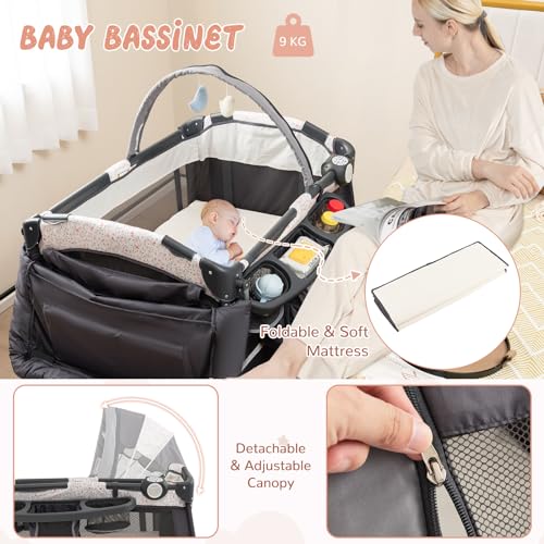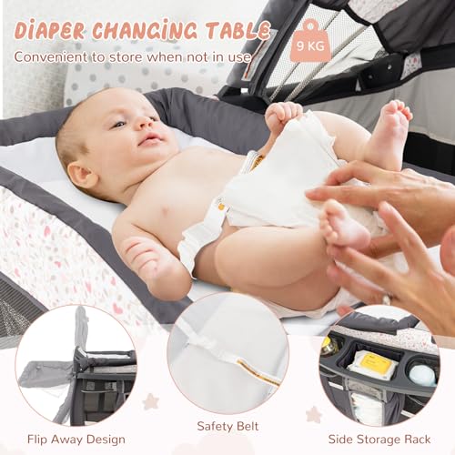 【Thoughtful Details & High Safety】The baby cot comes with a large storage bag to hold diapers, tissues and other baby necessities. The 4-sided breathable mesh and smooth round corner create a safe space for the baby to play, sleep, etc. Moreover, the detachable changing table is equipped with a safety belt to secure the baby.