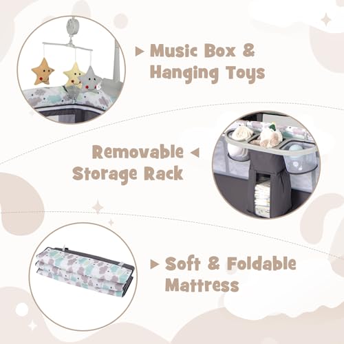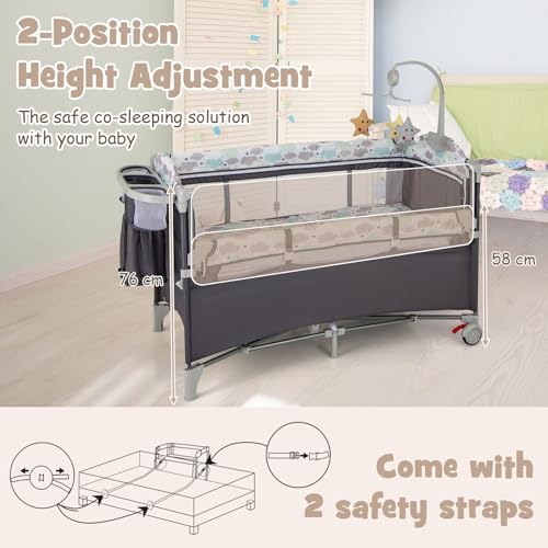 Specification: COSTWAY 5 in 1 Travel Cot, Folding Baby Playard with Bassinet, Mattress, Music Box, Hanging Toys, Storage Rack and Carry Bag, Lightweight Crib Suitable from Birth to 15kg (Grey)