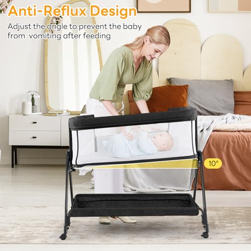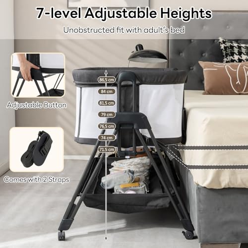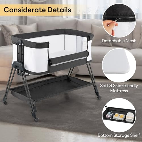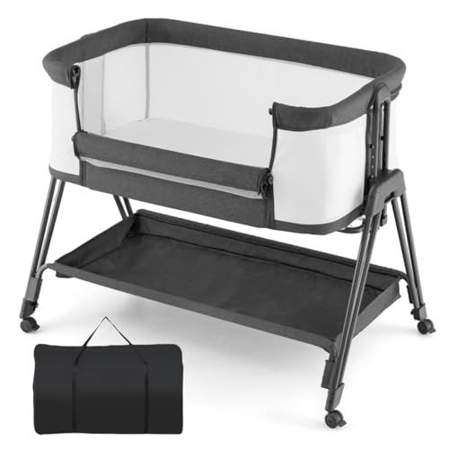 Specification: GYMAX Baby Bedside Crib, Foldable Infant Side Cot with Carry Bag, Storage Basket Mattress and Wheels, Height Adjustable Toddler Co-Sleeping Bed (Gray)