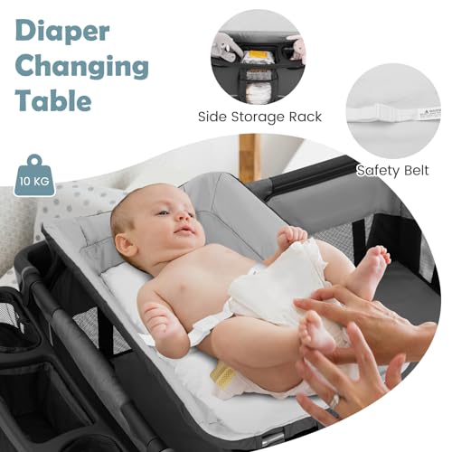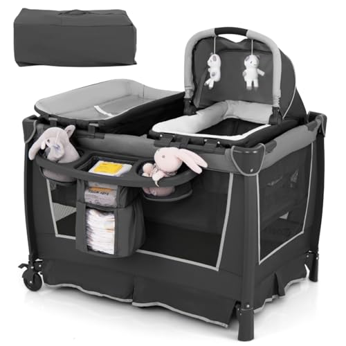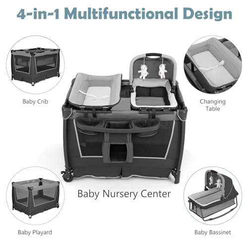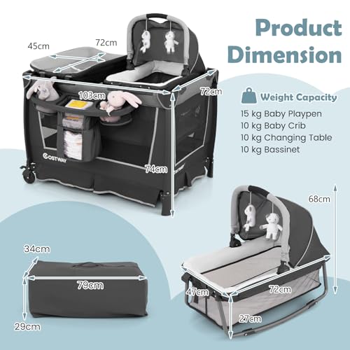 Specification: GYMAX Baby Travel Cot, 4-in-1 Foldable Infant Crib with Changing Table, Storage Basket, Toys and Wheels, Newborn Bassinet Bed from Birth to 15kg (Grey)