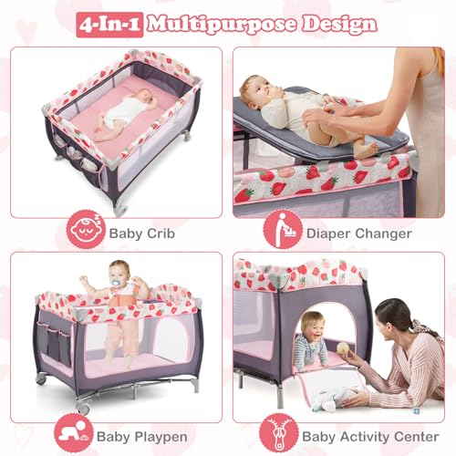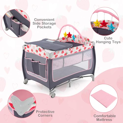GYMAX Folding Travel Cot, 4 in 1 Portable Baby Bed Playard, Diaper Changer, Mattress, Hanging Toys, Storage Pockets & Carry Bag, Infant Bassinet Nursery Center for Newborn