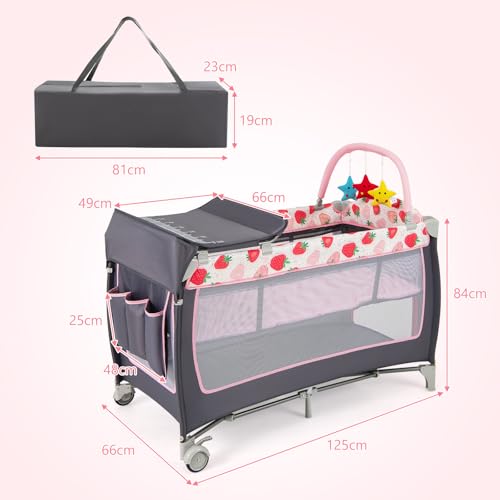 Specification: GYMAX Folding Travel Cot, 4 in 1 Portable Baby Bed Playard, Diaper Changer, Mattress, Hanging Toys, Storage Pockets & Carry Bag, Infant Bassinet Nursery Center for Newborn