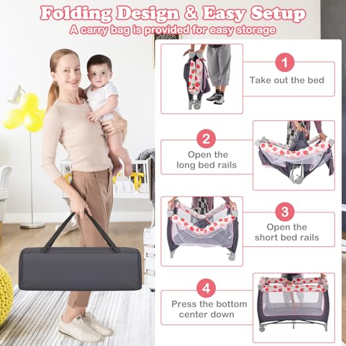 ✔EASY TO SET UP & FOLD- To assemble the baby bed, you just need 4 steps: ①take out the bed; ②open the long bed rails; ③open the short bed rails; ④press the bottom center down. Meanwhile, the baby crib can also be folded up and stored in the included carry bag for easy transportation.