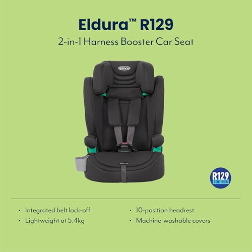 Graco Eldura R129 Harness Booster (76-145cm – 15 Months to Approx. 12 Years). Harness mode from 15 months to approx. 4 Yrs (76-105cm), Highback mode from approx. 3.5 to 12 yrs (105-145cm), Midnight