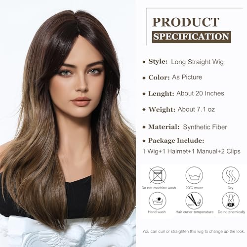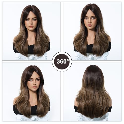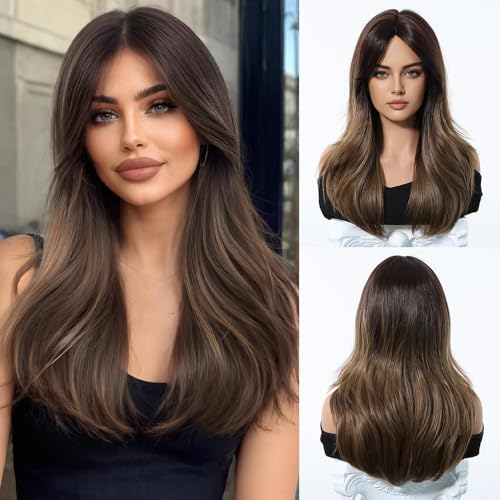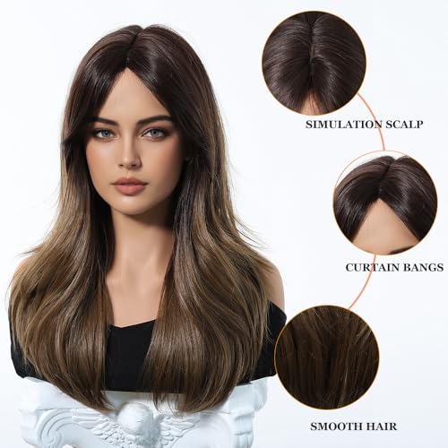 Esmee Long Straight Ombre Brown Wig for Women with Curtain Bangs Natural Synthetic Hair Wigs for Daily Party Use