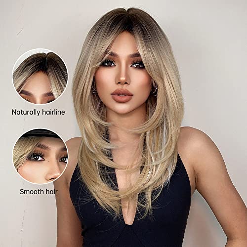 HAIRUCBE Ombre Blonde Wigs for Women Long Curly Heat Resistant Synthetic Wigs with Bangs