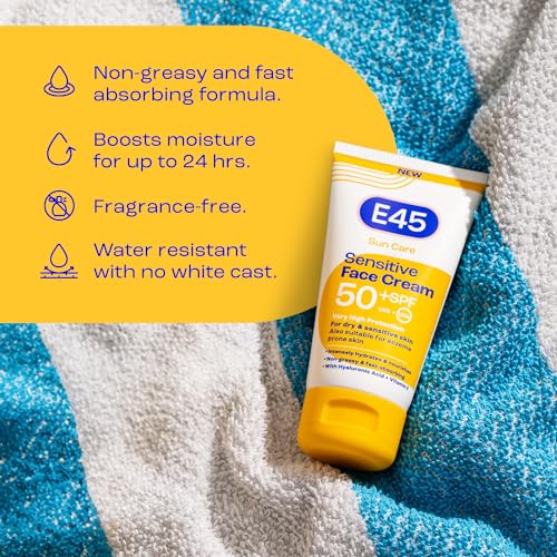 E45 SPF50+ Sensitive Sun Cream for Face with Hyaluronic Acid – UVA and UVB Protection – Fragrance-Free and Dermatologically Tested Sunscreen – Suitable For Dry, Sensitive and Eczema Prone Skin (50ml)
