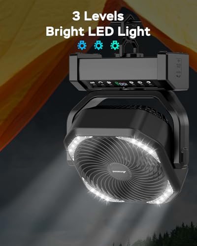 Amacool Camping Fan with Light, 20000mAh Rechargeable Battery Operated Fan, 112H Max Cooling Time, 8 Speeds, Digital Display, Remote Control, 270°Pivot with Hook for Tent Car RV Power Outage (Black)