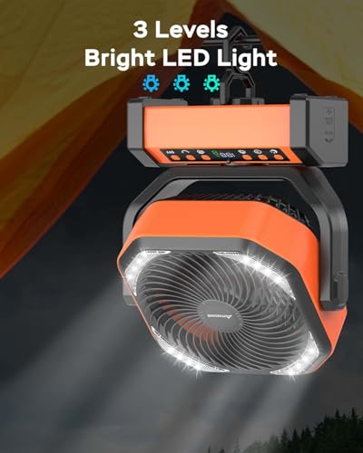 Amacool Camping Fan with Light, 20000mAh Rechargeable Battery Operated Fan, 112H Max Cooling Time, 8 Speeds, Digital Display, Remote Control, 270°Pivot with Hook for Tent Car RV Power Outage (Orange)