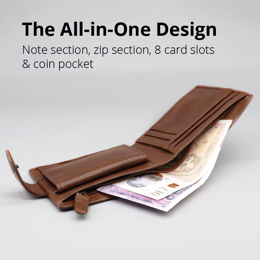 ALL-IN-ONE DESIGN – A men’s wallet that does everything: a spacious buttoned coin pouch, zip & note sections, and 8 slots in total. The RFID scannable external slot is for a high-use card you can just tap-and-go with without removing. Three internal slots are large slip-in pockets for multiple cards or receipts. The button fastener keeps it all compact and surprisingly slim. A wallet which works perfectly for any man in any situation.