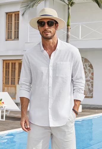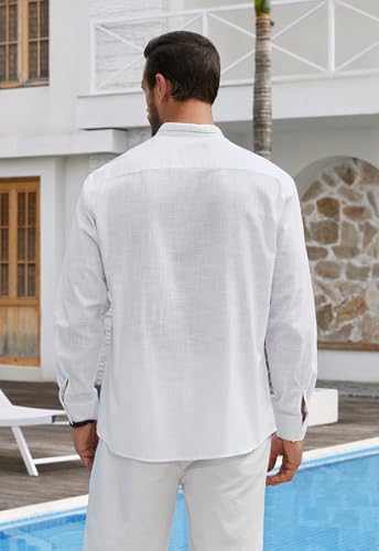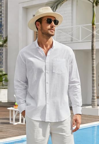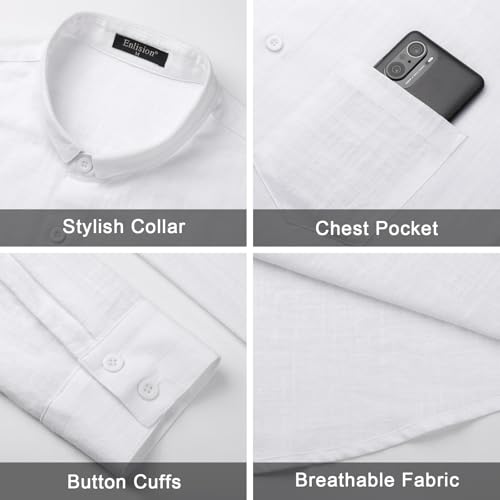 Enlision Mens Cotton Linen Shirts Long Sleeve Casual Henley Shirts Banded Collar Lightweight Solid Color Summer Beach Shirt Holiday with Pocket S-4XL
