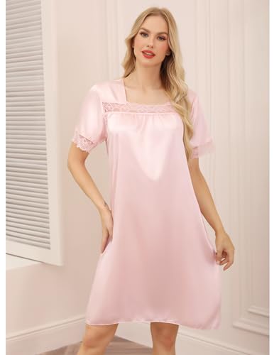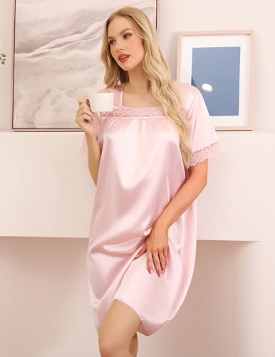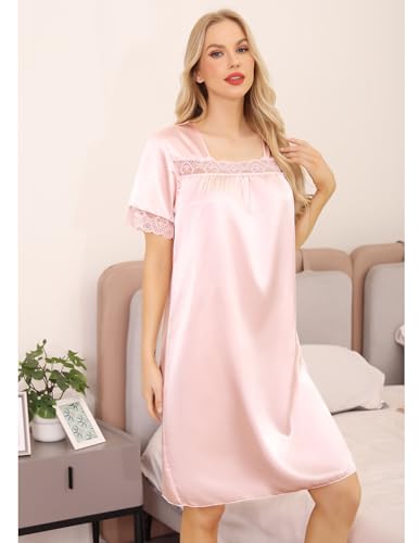 Lovasy Ladies Short Sleeved Lace Trim Satin Nightdress Silk Nighties for Women Soft Satin Night Dress Nighty Nightwear S-XXL