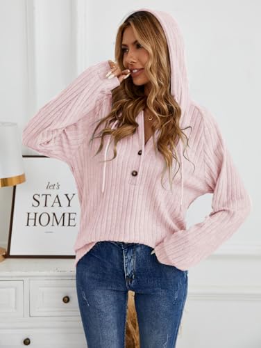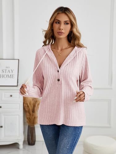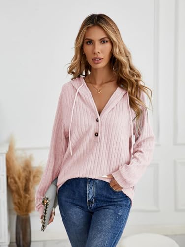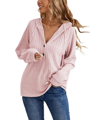 iChunhua Lightweight V Neck Hoodies for Women Uk Knitted Long Sleeve Hooded Tops With Buttons Thin Plain Hooded Sweatshirts