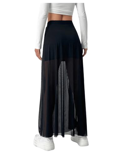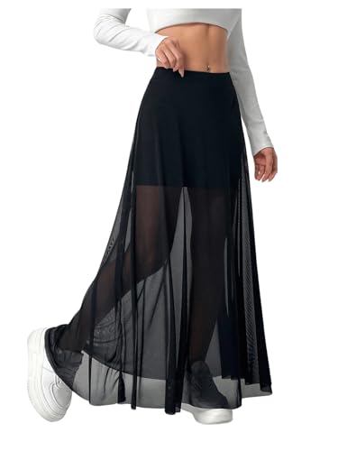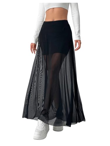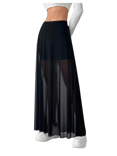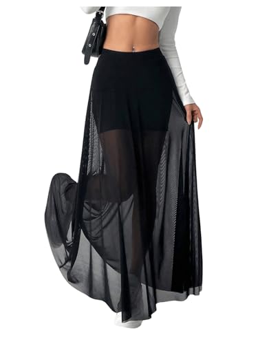 GORGLITTER Women’s A Line Mesh Sheer Maxi Skirt High Waisted Tulle Ruffle Hem Long Skirt