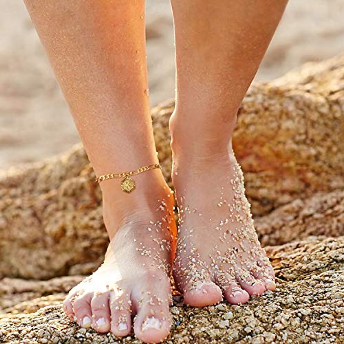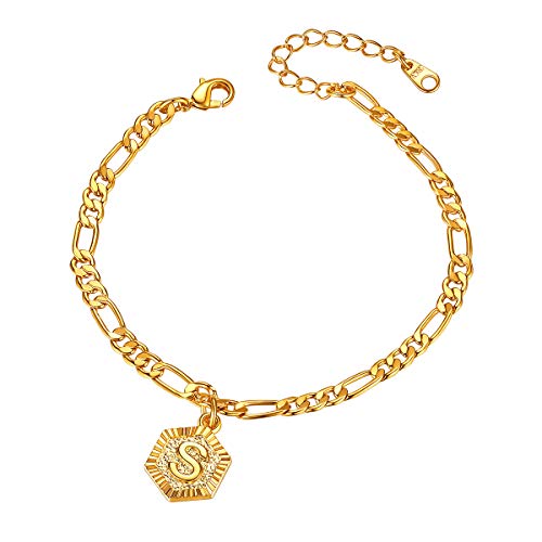 FOCALOOK Yellow Gold Plated Initial Anklets for Women Summer Jewellery 4.5mm Figaro Foot Chain Adjustable 8.5inch with 2inch Extender for Large Size(Send Gift Box)