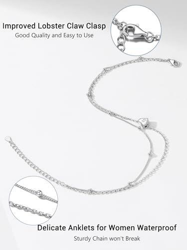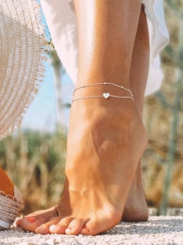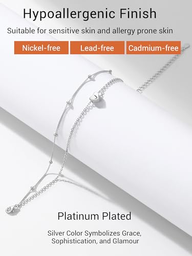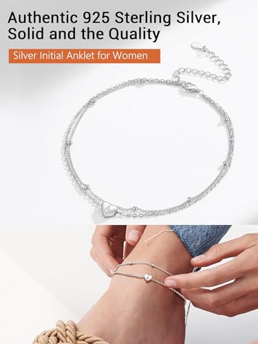 PROSILVER Women Initial Anklet Sterling Silver Heart Ankle Bracelet A-Z Letter, Adjustable Double-Layer Foot Chain for Beach Summer with Gift Box