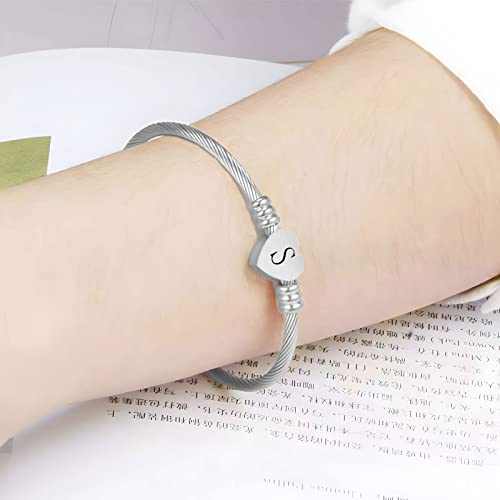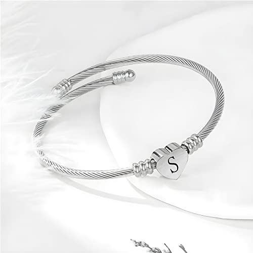KunBead Jewelry Women Girls Initial Letter Cuff Bracelet Silver Alphabet Love Heart Bangle Bracelets Gift for Birthday Stainless Steel