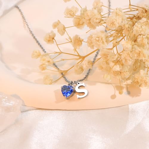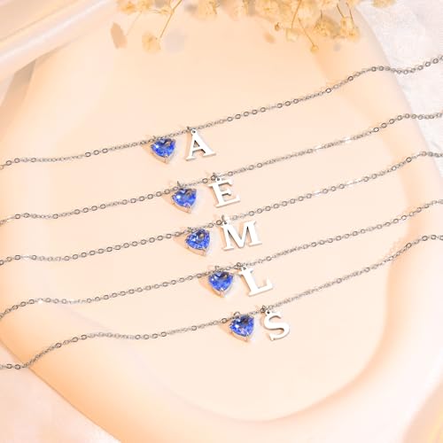 Tibond Silver Initial Necklace for Women Girls, Dainty Blue Heart Birthstone Jewellery Simple Necklace Gifts for Friendship Sister Daughter Mum Colleague on Birthday Christmas