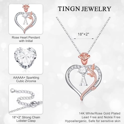 TINGN Gifts for Women Necklace, Rose Flower Initial Heart Necklaces for Women Jewelry Teen Girls Gifts Anniversary Birthday Gifts for Her Girlfriend Wife Mothers Day Gifts for Teen Girls Women Jewelry