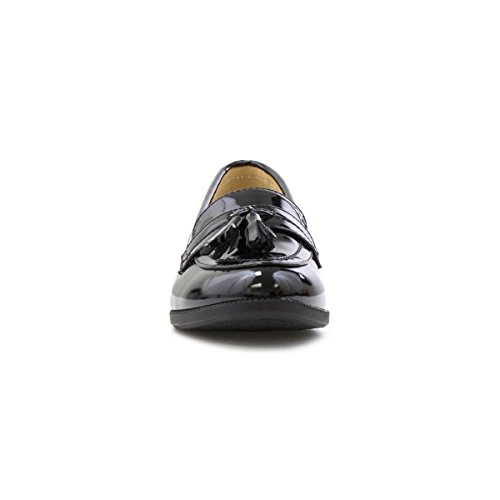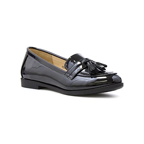Elevate your shoe game this season with the Anais women’s black patent loafers. Featuring a sleek black patent finish, these loafers boast a round toe, a stylish tassel detail at the front, and a cushioned insole for added comfort. Plus, the flat gripped outsole ensures stability. Perfect for daily office wear or any smart occasion.