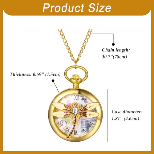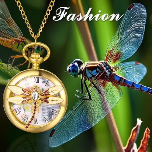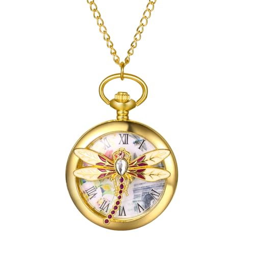 Oidea Mens Womens Pocket Watch: Gold Tone Hollow Embossed Dragonfly Decoration Roman Numeral Dial Analog Quartz Pocket Watches with Chain Graduation Christmas Birthday Gifts
