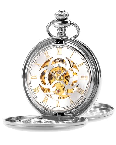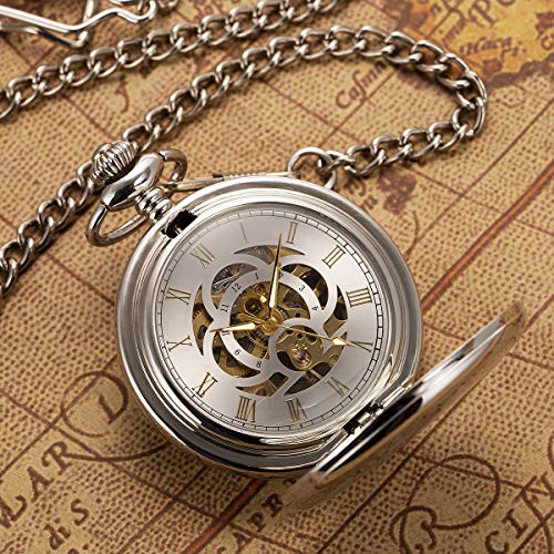 SIBOSUN Pocket Watch Mechanical Watches with Chain Roman Numeral Manual Winding Antique Gift Box Sliver