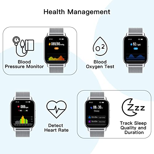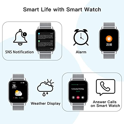[Get 2 Straps and a Health Assistant]: Each package contains 2 straps.(Width of strap is 22mm) This package contains silver stainless steel strap and gray silicone strap to suit your different occasions. This fitness watch can help you achieve a healthier and more active life with blood-pressure, blood-oxygen, heart rate measurement and sleep quality analysis. The fitness watch can record female physiological cycle and vibrate you when you sit too long.