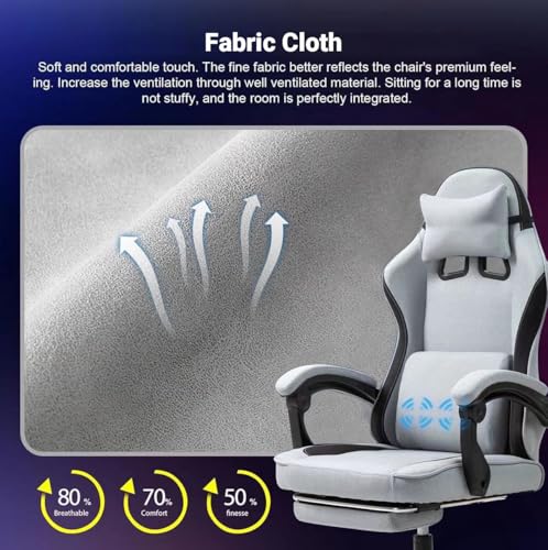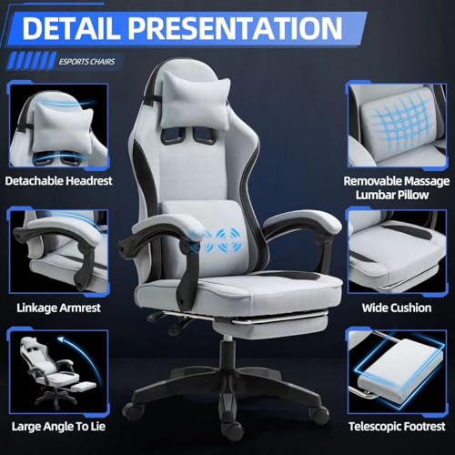 Fabric Massage Gaming Chair, Fabric Ergonomic Computer Chair, Video Game Chair, Massage Office Chair, Desk Swivel Chair, Adjustable, Reclining, Footrest, Massage Cushion, Fabric Material, Grey, New
