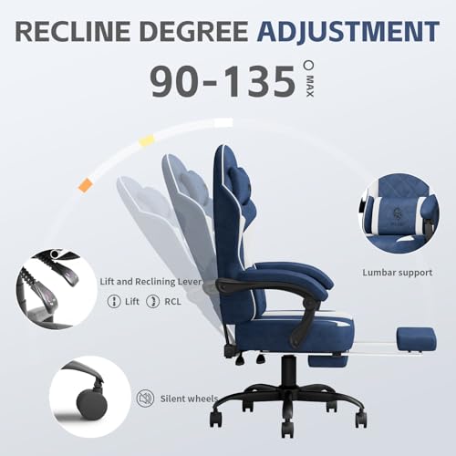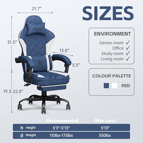 PZDO Gaming Chairs for Adults, Technical Fabric with Footrest, Gamer Chair with Height Adjustable 360° Swivel Seat, Ergonomic Computer Recliner Chair for Teens, 150 kg, Blue