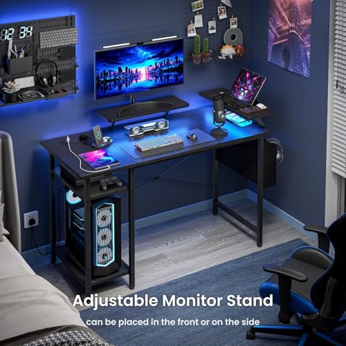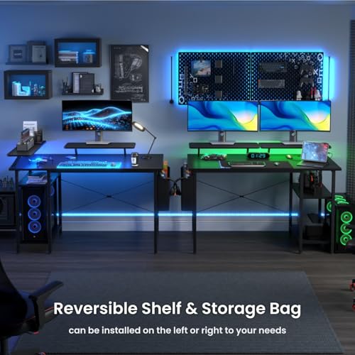 DOMSHOCT Gaming Desk with LED Lights & Power Outlets, Reversible Computer Desk with Storage Shelves & Dual Monitor Stands, for Home Office & Study, 100×50cm Black