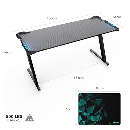 EUREKA ERGONOMIC Gaming Desk with Led Lights 156×64cm Large RGB Ergonomic Gaming Computer Desk for Home Office Work Study Writing with Mouse Pad, Easy to Assemble, Carbon Fiber Black